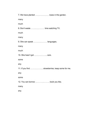 This document provides 12 sentences for a grammar exercise to practice using the determiners "much", "many", "some", and "any". For each sentence, the reader must choose between two determiners to correctly complete the sentence. The exercise tests understanding of when to use "much" versus "many" as well as "some" versus "any" in different contexts.