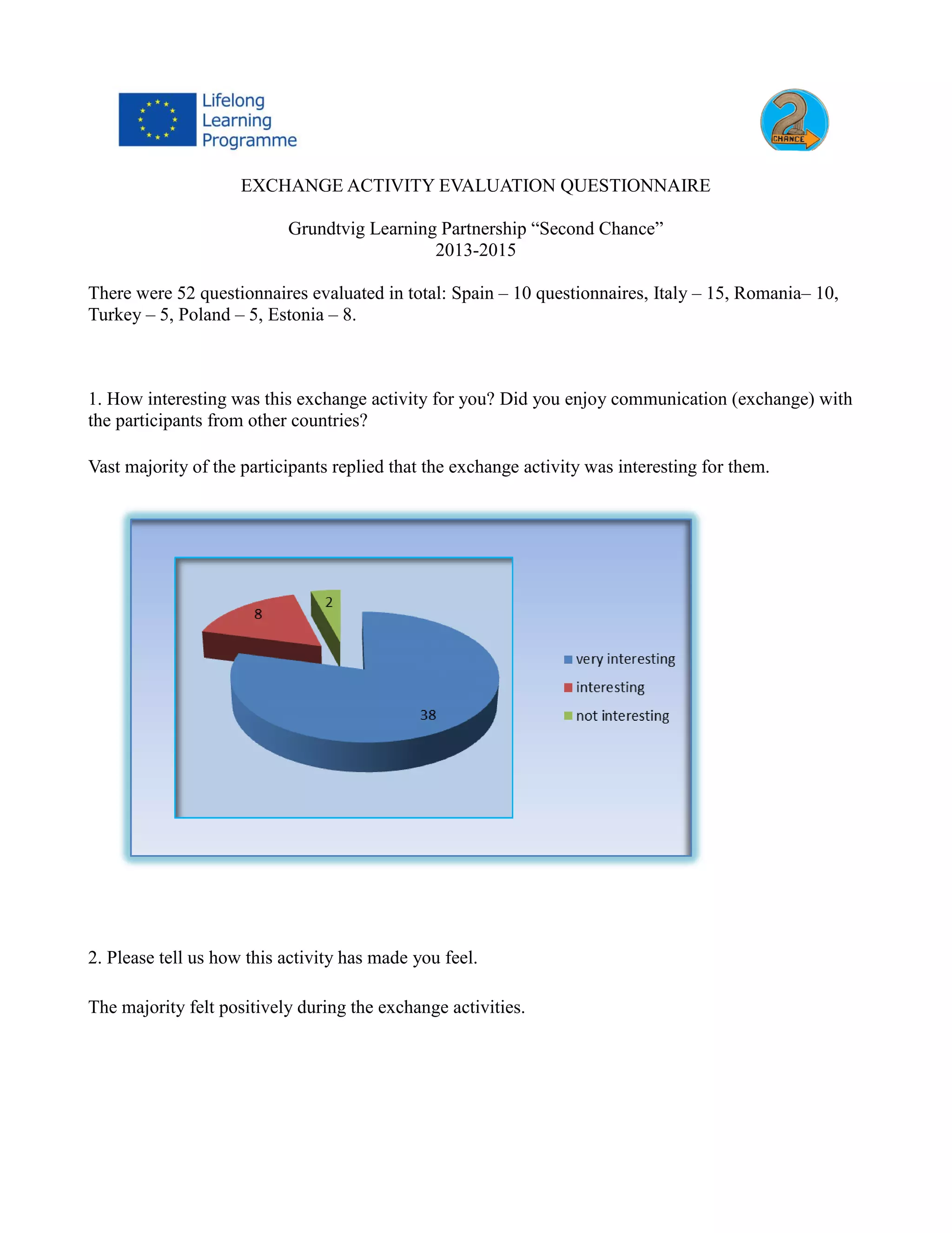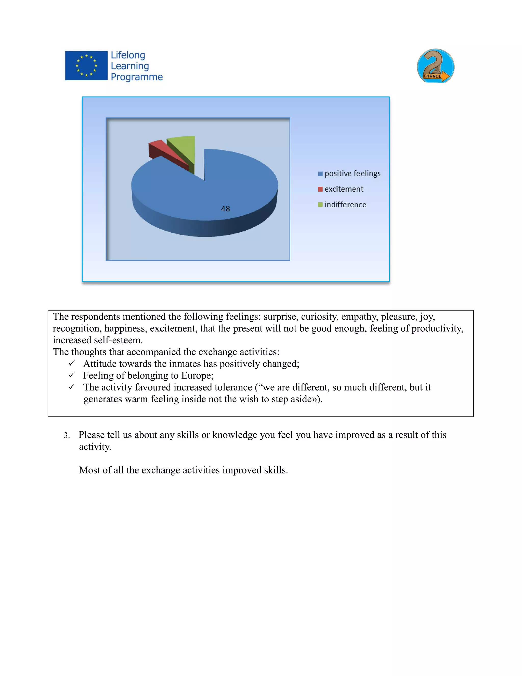 This document summarizes the responses from 52 questionnaires evaluating an exchange activity program between prisons in several European countries. The majority of participants found the activity interesting and enjoyed communicating with people from other countries. Respondents reported feelings of surprise, curiosity, and happiness. They felt it improved their creative skills and language skills. The most enjoyable aspects were sending positive messages to others, the classroom atmosphere, and learning about other cultures. Some participants felt it was unfair that prison conditions varied between countries. Overall, respondents found the activity useful, especially for their emotional well-being, knowledge, and creativity. Suggestions for future activities included providing more time, enabling more personal contact, and organizing exchanges based on shared interests.