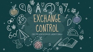 Jagriti Singh presented on the topic of exchange control for her B.Com semester 1 course. She discussed various aspects of exchange control including definitions, objectives, evolution, and methods. Direct methods of exchange control include government intervention in currency markets and imposing exchange restrictions. Indirect methods aim to influence the balance of payments through export subsidies and import tariffs/quotas. Exchange control is a technique used by governments to manage exchange rates and the flow of foreign currency.