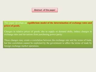 This paper develops an equilibrium model of the determination of exchange rates and prices of goods. Changes in relative prices due to supply or demand shifts induce changes in exchange rates and deviations from purchasing power parity. These changes may create a correlation between the exchange rate and the terms of trade, but this correlation cannot be exploited by governments to affect the terms of trade through foreign exchange market operations. The model emphasizes the role of relative price changes due to real disturbances and how these changes affect both exchange rates and the terms of trade through shifts in supply and demand. Government interventions in foreign exchange markets cannot influence exchange rates if the relationship between exchange rates and terms of trade is due to shifts in real supply and demand for domestic and foreign goods.