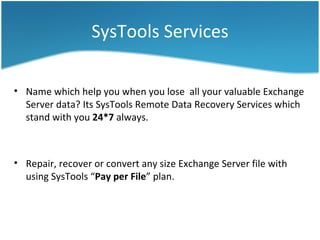 Systools offers remote data recovery services for Microsoft Exchange and SQL databases, providing solutions for lost or corrupted data files. The services include converting EDB files to PST format, recovering damaged data, and ensuring confidentiality. Users can access these services 24/7 and can contact Systools via email for assistance.