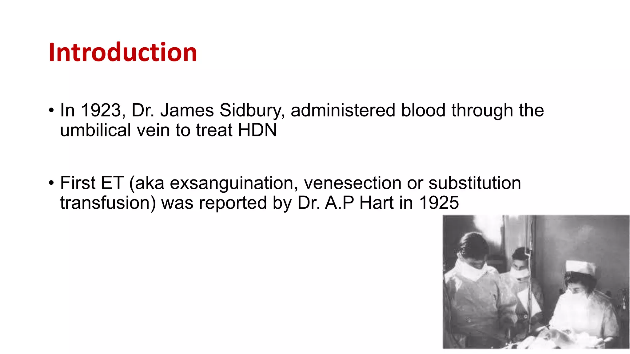 The document outlines the procedure for exchange transfusion (ET) in neonates, detailing its historical background, definitions, indications, necessary preparations, equipment, and procedural steps. It emphasizes the management of hemolytic disease of the newborn and associated complications while highlighting safety measures during the procedure, including monitoring and post-exchange care. Additionally, it includes information on potential complications and responsibilities of the healthcare team throughout the process.