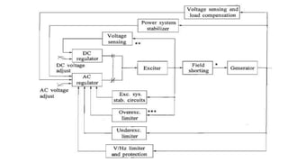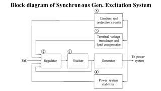 The document discusses different types of excitation systems used in synchronous generators including DC, AC, and static excitation systems. It describes the components and operating principles of various excitation system configurations. Key topics covered include AC and DC voltage regulators, stabilizing circuits, power system stabilizers, load compensation, and over-excitation and under-excitation limiters used to protect the generator.