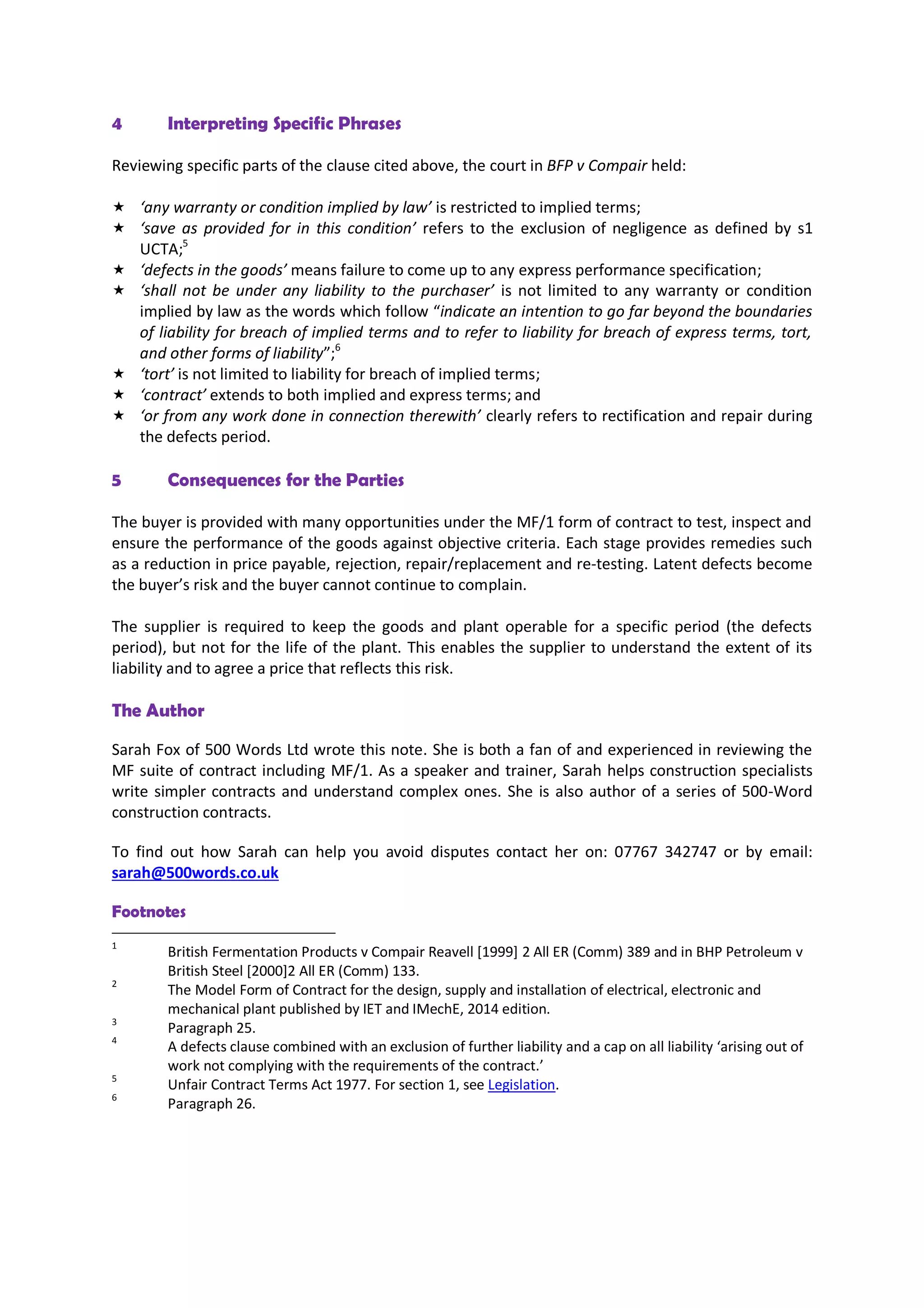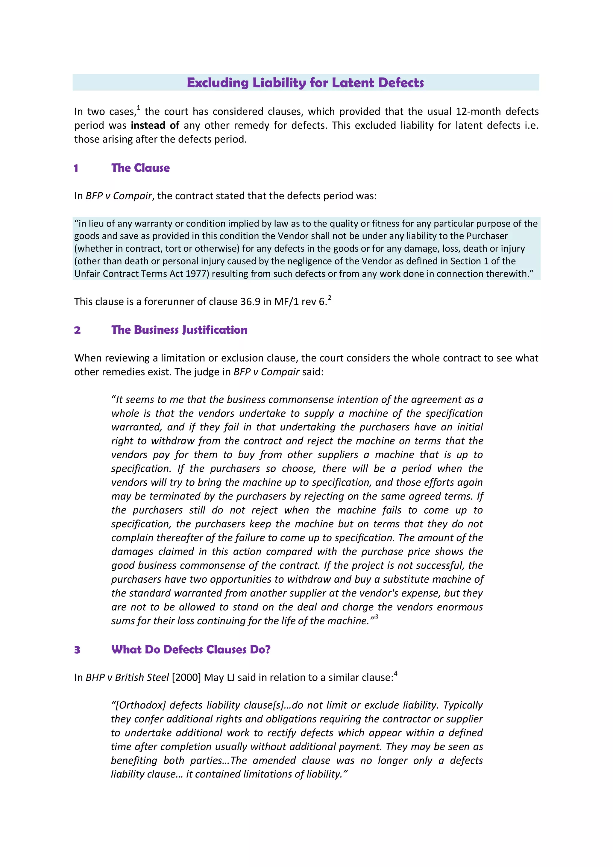The document discusses the legal implications of liability exclusion clauses for latent defects in contracts, particularly referencing the case of BFP v Compair. It highlights how clauses can limit or exclude vendor liability while outlining the rights and responsibilities of both parties concerning defects and repairs. Additionally, it explains the consequences for buyers, who bear the risk of latent defects after a certain period, and provides insights from Sarah Fox on contract simplification and dispute avoidance.