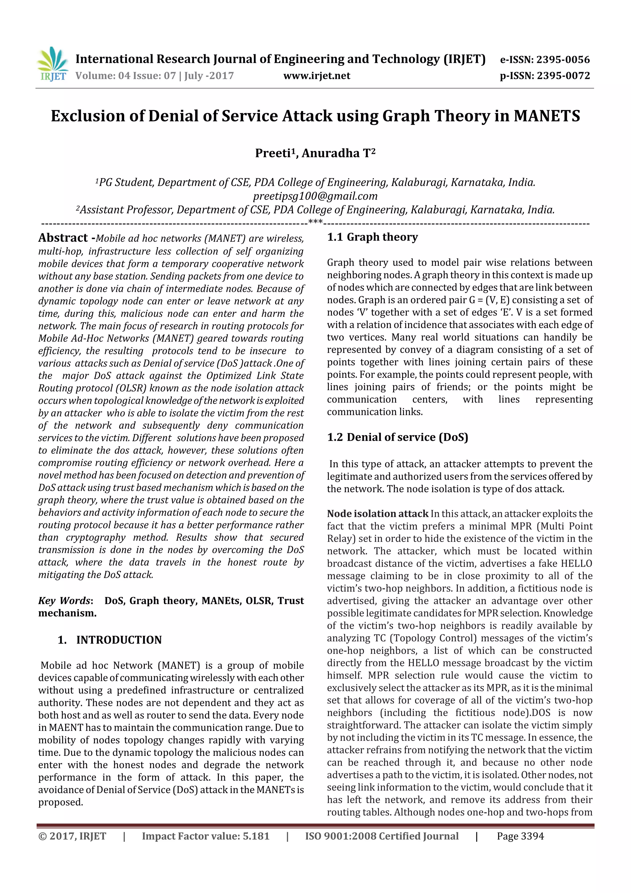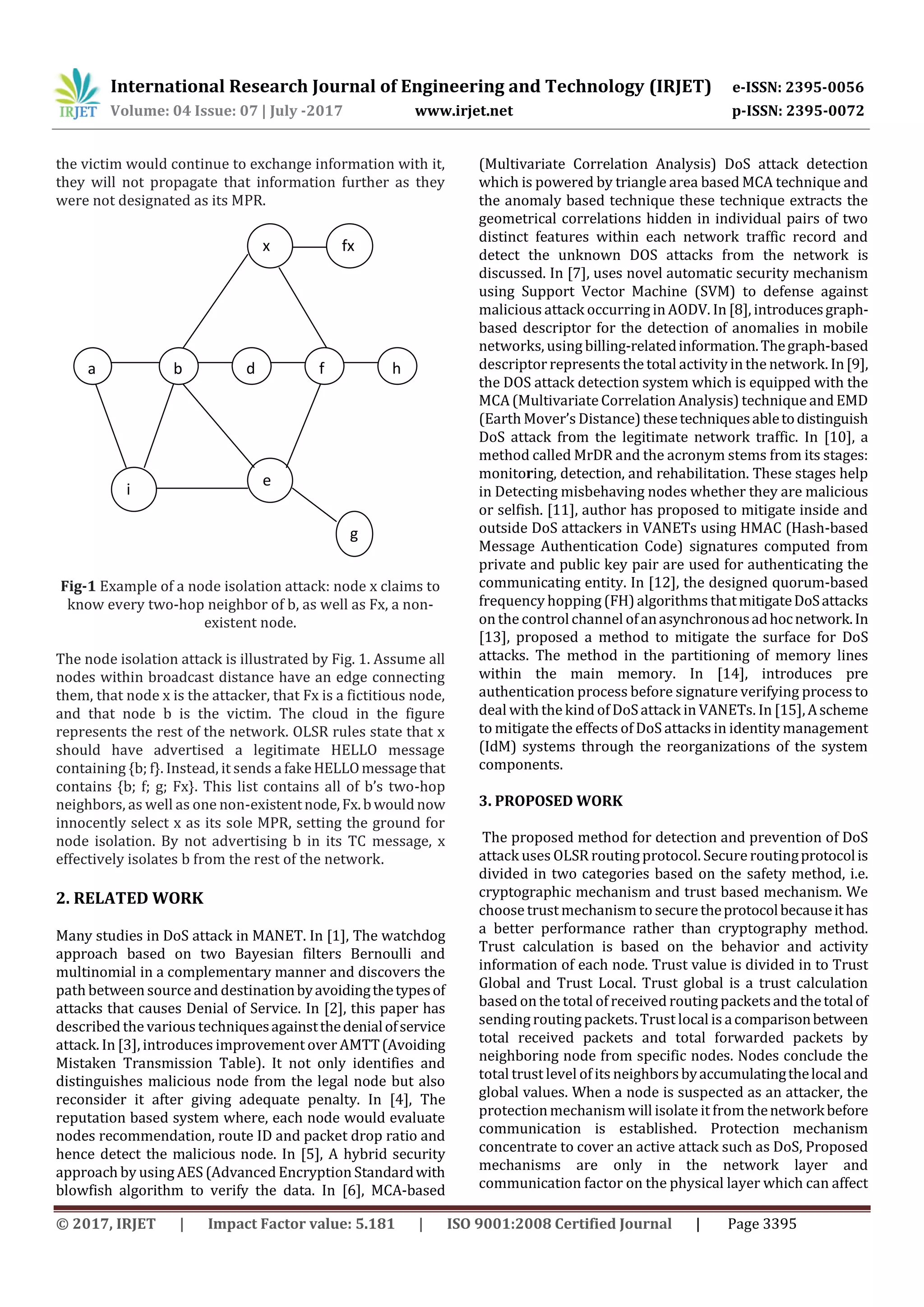 This document proposes a method to detect and prevent denial of service (DoS) attacks in mobile ad hoc networks using a trust-based mechanism. It involves calculating trust values for each node based on their behavior and activity, including the number of routing packets sent and received. Nodes with low trust values that are suspected of attacks will be isolated from the network. The method was tested in an ad hoc network simulation using NS-2 and showed improved performance metrics like higher packet delivery ratio, lower delay, jitter and dropping ratio compared to a network under DoS attack. This demonstrates that the trust-based mechanism can effectively detect DoS attackers and secure routing in the mobile ad hoc network.