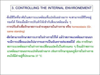 INTERNAL ENVIRONEMENT -สิ่งมีชีวตที่อาศัยในสภาวะแวดล้ อมที่แปรผันอย่ างมาก จะสามารถมีชีวตอยู่ ิ ิ รอดได้ ก็ต่อเมื่อมีการปรับตัวให้ เข้ ากับสิ่งแวดล้ อมนัน ๆ ้ -การปรับตัวเพื่อรักษาสภาวะธารงดุลภายในร่ างกาย หรือ homeostasis (Gr. same standing) -สัตว์ สามารถรักษาสภาวะภายในร่ างกายไว้ ได้ แม้ ว่าสภาพแวดล้ อมภายนอก จะมีการเปลี่ยนแปลงไปมากจนอาจเป็ นอันตรายต่ อเซลล์ ได้ เช่ น การรักษา สภาวะแวดล้ อมภายในร่ างกายเปลี่ยนแปลงไปในช่ วงแคบ ๆ ถึงแม้ ว่าสภาวะ แวดล้ อมภายนอกจะแปรผันอย่ างมาก เช่ นการรักษาอุณหภูมภายในร่ างกาย ิ คนให้ มีค่าอยู่ท่ประมาณ 37 oC ี