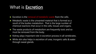 The document provides an overview of excretion and osmoregulation, detailing the processes by which metabolic waste is removed from the body, primarily through the kidneys. It explains various modes of excretion (ammonotelism, ureotelism, and uricotelism) and describes the human excretory system, highlighting the role of nephrons and the process of blood filtration and urine formation. The text also outlines the structure and function of different organs involved in excretion, such as the kidneys, ureters, urinary bladder, and urethra.