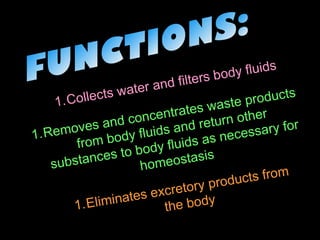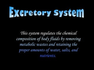 1. The excretory system regulates chemical composition of body fluids by removing waste and maintaining proper water, salt, and nutrient levels.
