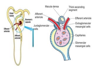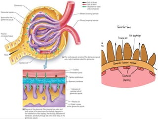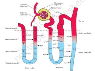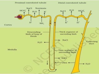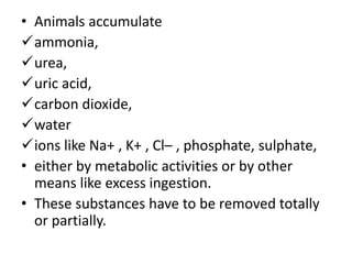 The document summarizes excretion in animals and humans. It discusses the major nitrogenous wastes excreted, such as ammonia, urea, and uric acid. It describes the key excretory organs in different animal groups, including kidneys, nephridia, malpighian tubules, and green glands. For humans, it outlines the structure and function of nephrons, collecting ducts, and other components of the urinary system in removing wastes and regulating water and electrolyte balance. Key processes like glomerular filtration, reabsorption, and the countercurrent mechanism are also explained.