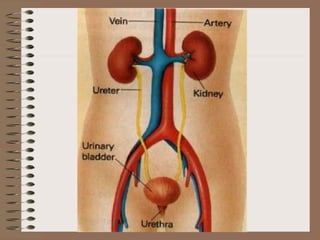 The excretory system removes waste from cells and regulates water levels in the blood. The kidneys are responsible for cleaning the blood by removing urea and other metabolic wastes and excess water, and excreting them as urine. They receive around 500 gallons of blood per day to filter through and clean. The kidneys regulate water levels to maintain homeostasis and prevent blood from becoming too dilute or concentrated.