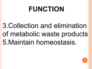 The document discusses the human excretory system. It describes the functions of excretion and homeostasis. The main excretory organs are the kidneys, which filter wastes from the blood to produce urine. The kidneys are bean-shaped organs located on either side of the spine that contain millions of nephrons for filtration. Urine is formed through processes of filtration, reabsorption, and excretion in the nephrons and is carried out of the body through the ureters, urinary bladder, and urethra. Common kidney disorders addressed include acute and chronic kidney failure and kidney stones.