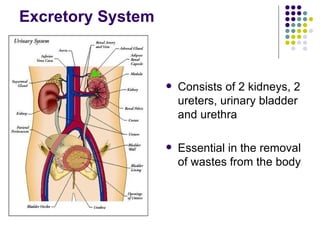 The excretory system consists of the kidneys, ureters, urinary bladder, and urethra, and is essential for removing waste from the body. The kidneys filter blood to remove waste and regulate salt levels, producing urine that passes through the ureters into the bladder. The bladder stores urine until it is expelled through the urethra. Other excretory organs include the skin, which sweats out salt and water, the large intestine and lungs, which remove waste, and the liver, which produces bile to remove waste from the blood.