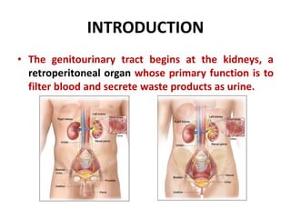 The genitourinary system consists of the kidneys, ureters, urinary bladder, and urethra. The kidneys filter waste from the blood to produce urine. Each kidney contains approximately 1 million nephrons, which are the functional filtering units of the kidney. In the nephrons, blood is filtered in the glomerulus and most of the filtrate is reabsorbed, with the remaining filtrate becoming urine. Urine travels from the kidneys through the ureters to the urinary bladder, where it is temporarily stored until urination through the urethra.