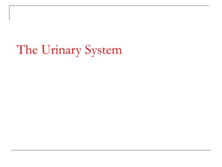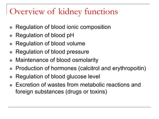 The document provides detailed information about the anatomy and physiology of the urinary system. It describes the key functions of the kidneys, which include regulating fluid and electrolyte balance, blood pressure, and blood pH. The basic unit of the kidneys is the nephron, which filters blood to form urine and reabsorbs necessary substances like water and electrolytes. Glomerular filtration occurs through specialized blood vessels that allow filtration based on size. Tubular reabsorption and secretion then modify the filtrate as it passes through the nephron before being excreted as urine.