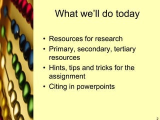 This document provides information about conducting research, including defining primary, secondary, and tertiary sources. It discusses how to search for information using library databases and the types of sources found on the web. The document emphasizes the importance of research ethics, defining plagiarism, paraphrasing, quoting, and citing sources. It explains when to cite sources and different citation styles and concludes by advertising research consultations available from librarians.
