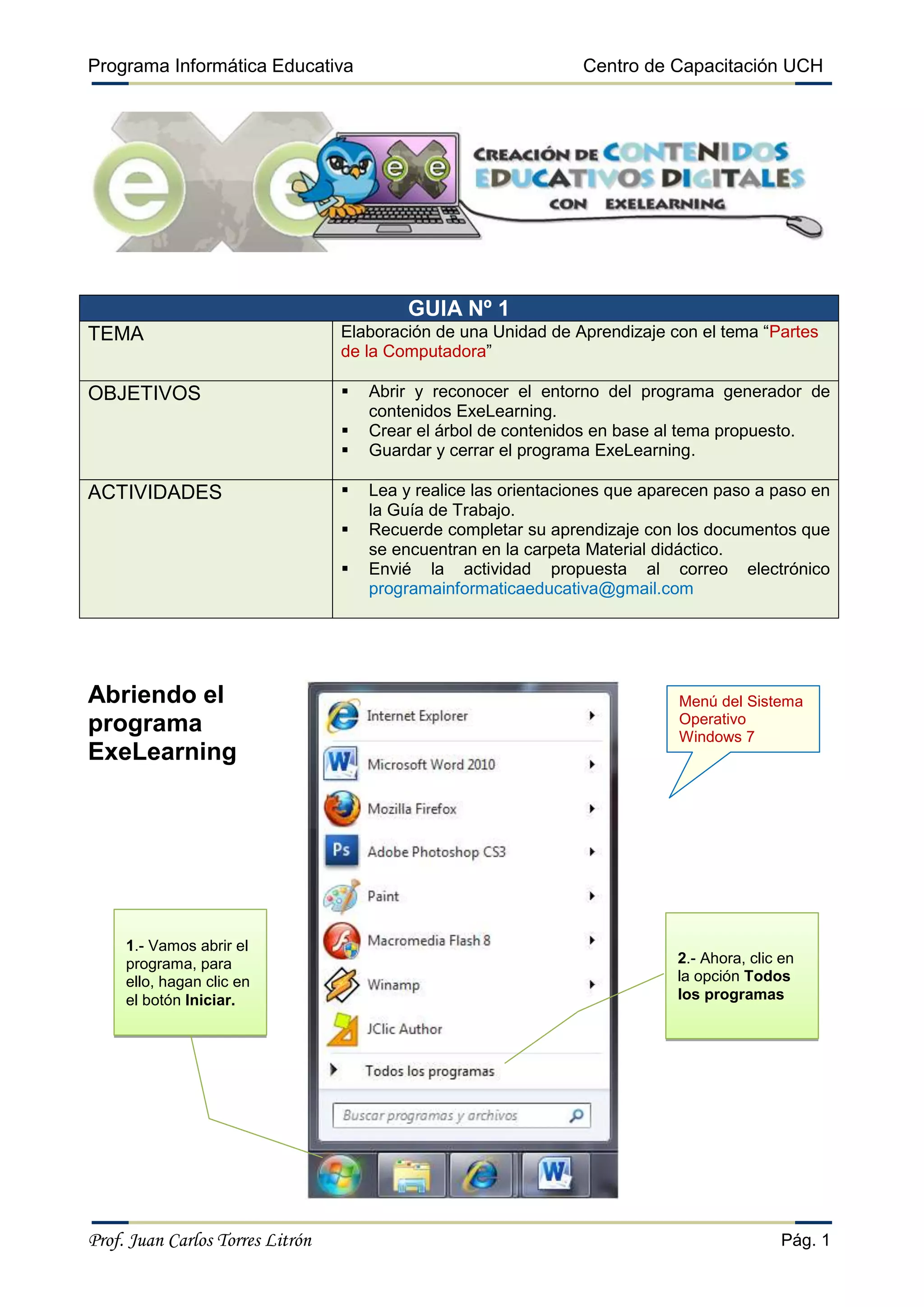 El documento provee instrucciones para crear una unidad de aprendizaje sobre las partes de la computadora usando el programa ExeLearning. Los objetivos son abrir ExeLearning, crear el árbol de contenidos sobre partes de la computadora, y guardar y cerrar el programa. Se guía al usuario paso a paso para crear el árbol de contenidos con tres niveles, incluyendo páginas sobre periféricos de entrada, periféricos de salida, y partes internas. Finalmente, se guarda el archivo como un archivo .elp y se cierra el programa