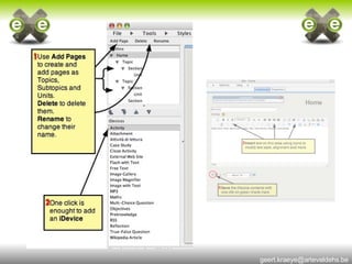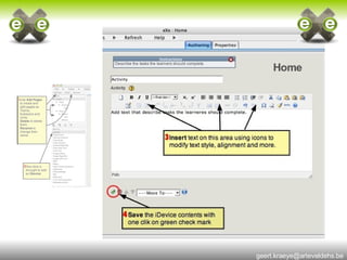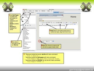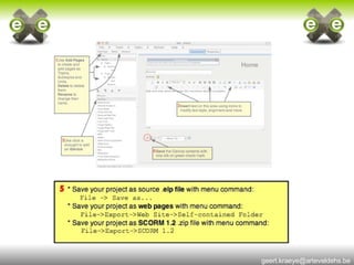 eXe is a free and open-source e-learning authoring tool that allows teachers to create professional-looking online courses without needing HTML or web development skills. It provides an intuitive interface that supports adding text, images, videos and other multimedia as well as integrating with learning management systems and meeting SCORM standards. eXe can be run from removable media without installation and used offline for content creation.