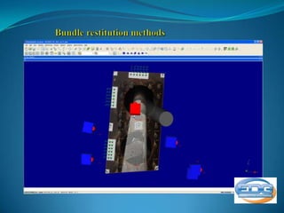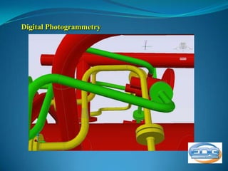 The document discusses digital photogrammetry techniques for capturing 3D spatial data of structures and objects. It notes that photogrammetry using consumer cameras and computer vision offers a high-accuracy alternative to laser scanning in some cases. The text provides details on how photogrammetry projects are conducted, including taking 13-20 photos over 1 hour, analyzing photos based on placing reference marks in overlapping photos, and extracting 3D point data within an hour for quality checking. It also outlines when photogrammetry is a feasible option compared to other methods.