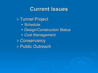 - Public outreach activities include groundbreaking coverage in local media, informative signage, and coordination with groups to promote participation in the tunnel bidding process.