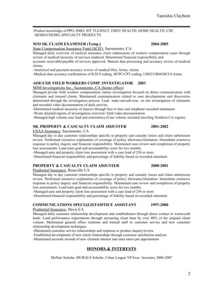 Tamishia Clayborn is a business management executive with over 13 years of experience in the insurance industry. She has held positions including Benefit Integration Manager and Senior Claims Development Specialist. She has a Bachelor's degree in English and African & African-American Studies from UC Davis and a Master's in Business Administration from the University of Phoenix. She has experience managing operations, building relationships, ensuring compliance, and leading teams.