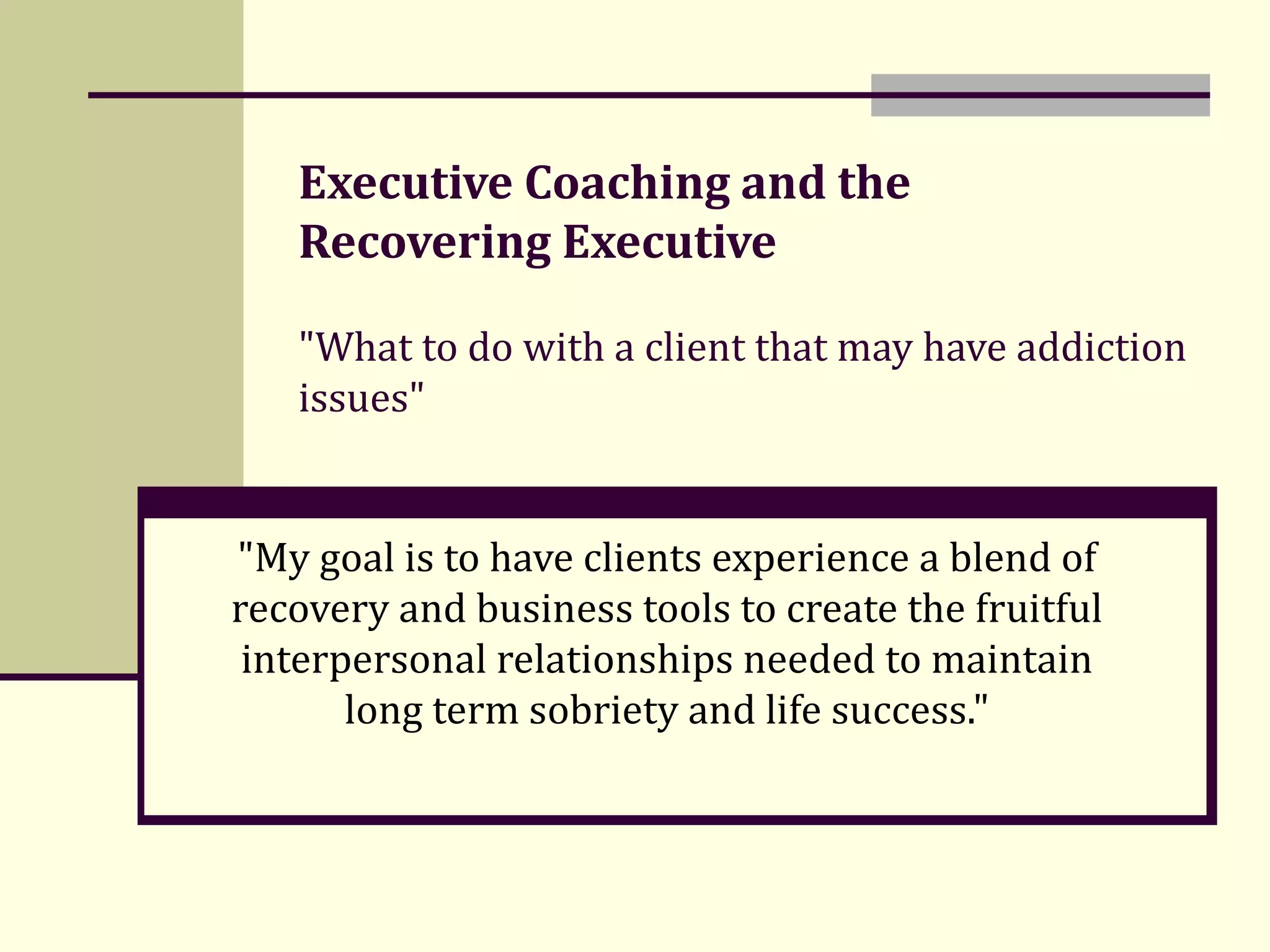 Melissa Killeen, an executive coach with extensive experience in recovery and business, helps clients blend recovery and business tools to foster relationships crucial for long-term sobriety and success. She utilizes assessments to tackle addiction-related behaviors, develop recovery plans, and navigate difficult interpersonal dynamics while encouraging commitment and personal growth. Killeen's approach incorporates conflict resolution techniques and emphasizes self-awareness as clients face changes and challenges in their recovery journey.