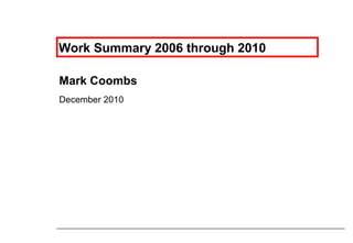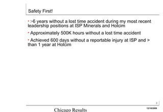 Mark Coombs worked as a leader at ISP Minerals and Holcim from 2006 to 2010. During this time period, he achieved several safety and operational accomplishments including over 6 years without a lost time accident across 500,000 hours of work. Specifically at ISP Minerals, he achieved 600 days without a reportable injury and improved mill production rates, electrical energy costs, and housekeeping scores.
