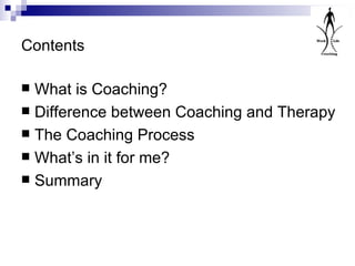 Coaching is an ongoing relationship that focuses on helping clients achieve their goals and realize their potential. It differs from therapy in that coaching empowers already functioning individuals to higher levels of performance, while therapy treats trauma or dysfunction. The coaching process involves setting goals, developing strategies to achieve them, addressing obstacles, and creating action plans over regular sessions driven by the client's agenda. Coaching can help improve work performance and leadership skills, as well as provide measurable benefits like increased salaries and returns on investment for companies.
