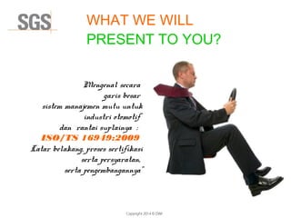 This document discusses ISO/TS 16949, the quality management system standard for the automotive industry and its supply chain. It provides background on the development of ISO/TS 16949 from 1994 to present. It also discusses the IATF which established global oversight offices to implement and manage ISO/TS 16949 certification. Additionally, it addresses customer specific requirements that may need to be reviewed and implemented along with ISO/TS 16949.
