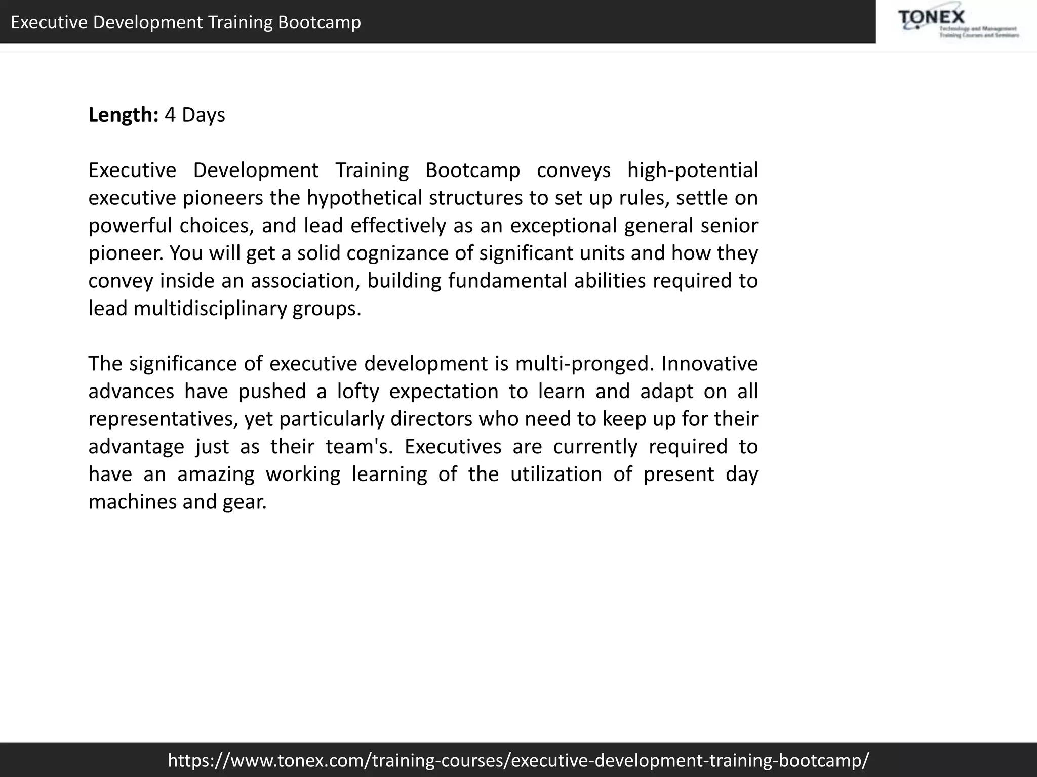 This document describes a 4-day executive development training bootcamp offered by Tonex. The bootcamp aims to provide executives with theoretical frameworks for effective decision making, leadership, and managing multidisciplinary teams. It covers topics such as leadership styles, strategic planning, financial analysis, and case studies. The bootcamp uses lectures and hands-on exercises to help participants develop skills for roles like strategic planning, marketing leadership, and developing persuasive visions. It is intended for professionals such as executives, managers, business owners, and board directors.