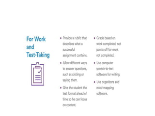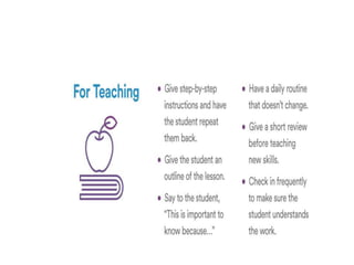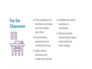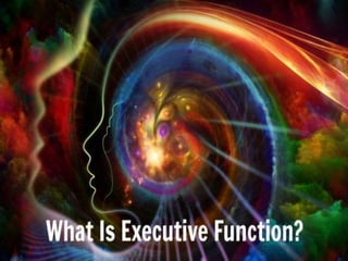 This document discusses executive functioning skills and classroom accommodations that can help students with executive functioning difficulties. It defines executive functioning as skills that support learning like attention, working memory, cognitive flexibility, and inhibitory control. The document recommends accommodations like initiating action, maintaining attention, organizing work, planning projects, and improving working memory. It describes common behaviors seen in students with executive functioning issues and closes by emphasizing the importance of executive functioning for school success and its role in self-control, reflection, and considering multiple perspectives.
