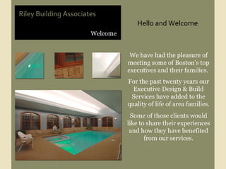 Riley Building Associates provides remodeling and custom home building services to executives in the Boston area. They offer design concierge services, financial project planning, and work with artisan craftspeople. Past clients praise their communication, attention to budget and schedule, and the high quality of their work.