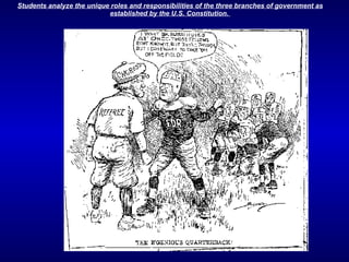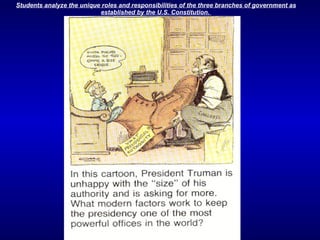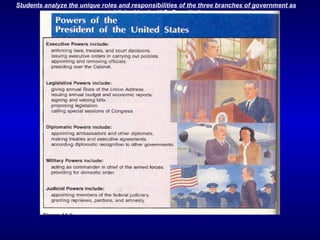 The document discusses the growth of executive power in the US presidency over time. Early presidents like Washington had limited power, but more recent presidents have expanded executive authority. The presidency has become more powerful due to factors like unified leadership, crisis response expectations, and the rise of federal agencies to implement policy. Key executive powers include issuing executive orders to carry out laws, appointing officials, and claiming executive privilege, though the scope of the latter is constrained by Supreme Court rulings.