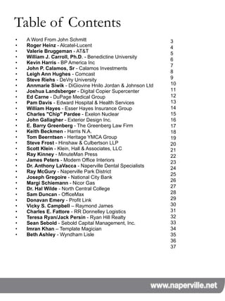 The document provides profiles of various CEOs. It begins with an introduction from the Chamber of Commerce President thanking the CEOs for their commitment and support. The profiles are then listed alphabetically and provide 1-2 paragraphs on each CEO's background, experience, and current role.