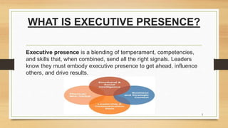 Executive presence involves both offline behaviors like body language and dress as well as online presence on social media. It helps career advancement by strengthening a leadership personal brand and perception as a leader. Developing executive presence automatically improves how others view, think about, and feel towards someone as a leader. It counts for 26% of what is needed to get ahead in today's global marketplace. Personal branding and executive presence are related but distinct - personal branding is marketing an individual career as a brand while executive presence strengthens one's leadership brand and reputation through behaviors, competencies and skills. Tools to build executive presence include embracing unique value, self-awareness, thinking before speaking, engaging audiences, and employing wit. For CEOs specifically,