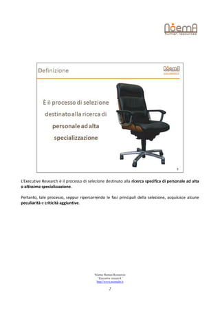 L'executive research è un processo di selezione specializzato per personale altamente qualificato, che presenta specifiche criticità come il costo e la scelta della società di ricerca. Le fasi principali includono analisi del mercato, individuazione delle competenze distintive, ricerca diretta e negoziazione con i candidati. Nòema offre un servizio personalizzato e ha ottenuto la certificazione ISO 9001-2008, mirato a migliorare continuamente l'erogazione dei servizi.