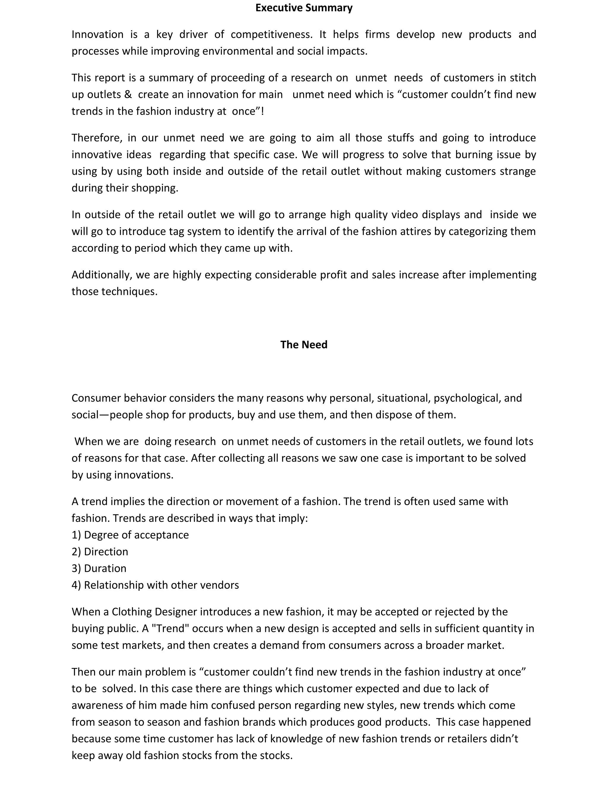 This document proposes innovations to address an unmet customer need in fashion retail outlets. Specifically, customers often cannot easily find new trends. The proposed solutions include installing high-quality video displays outside the outlet showing new products and trends, and implementing a color-coded tag system inside to categorize items by their age. The tags would be green for new items (1-30 days), blue for mid-age items (30-60 days), and gray for older items (>60 days). This aims to better inform customers of current trends and remove outdated stock. The innovations also intend to increase awareness, sales, and profits.
