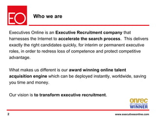 Executives Online is an international executive recruitment company specializing in rapid placement of interim and permanent management roles, utilizing an innovative online talent acquisition engine. The firm focuses on reducing recruitment time and costs while maintaining a high success rate, operating across multiple countries with a vast database of over 93,000 candidates. Their recruitment process includes thorough candidate evaluation and tailored client service, ensuring satisfaction for a diverse range of clients, including blue-chip companies and SMEs.