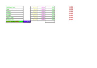 The document lists various grocery items including foods like tortillas, eggs, beans, rice, oils, meats, fruits and vegetables. It also includes drinks, dairy products and cleaning supplies. For each item it shows the cost amount, quantity, price, subtotal, price with tax, tax percentage which is 15%, and total with tax. However, all subtotals, prices and totals are listed as $0.00 since no quantities have been selected for purchase yet.