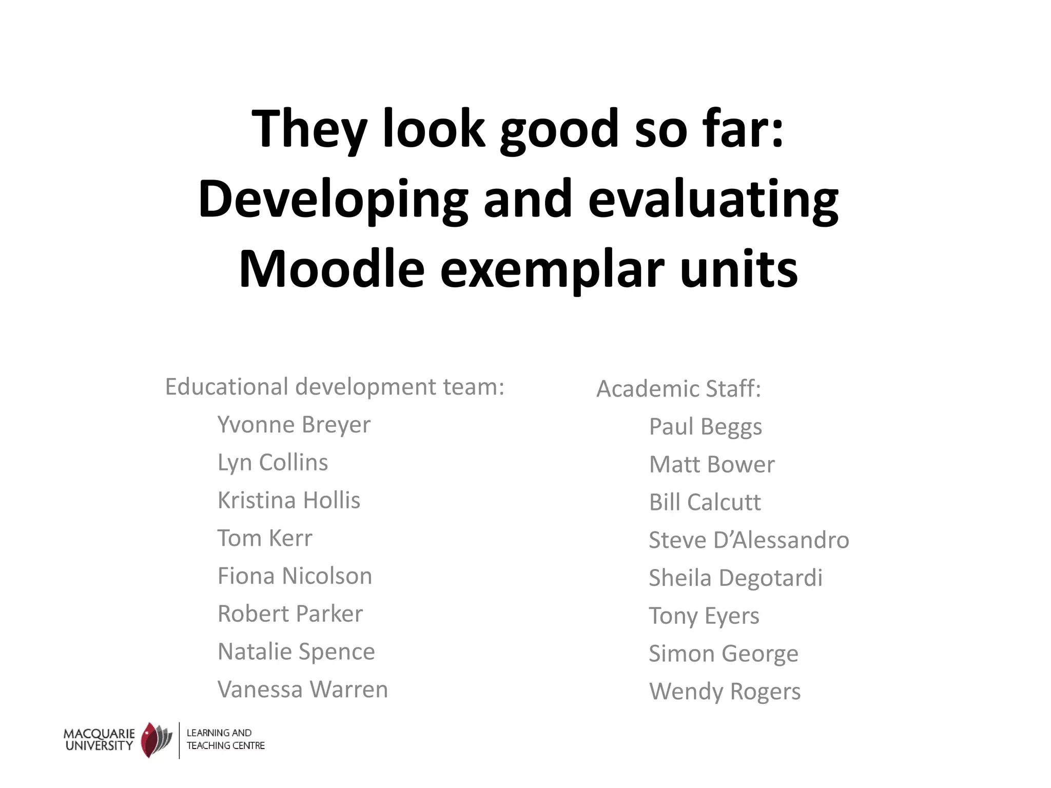 The document outlines the development and evaluation of exemplar units in Moodle by an educational development team and academic staff at a university. It includes background information, design considerations, a selection of exemplars from various courses, and future evaluation plans for the project. The aim is to create model units that can be copied and imitated for educational purposes.