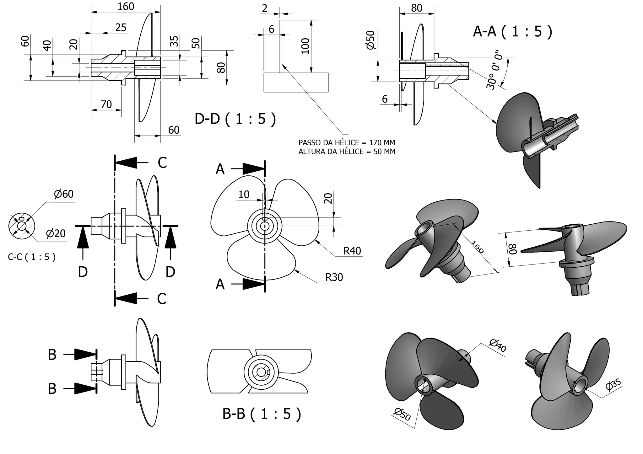 The document shows a technical drawing with dimensions for an engineering part. It includes six views - two orthographic views and four cross-sectional views - with labeling for dimensions, tolerances, and other annotations like "passo da lice" and "altura da lice". The scales for the cross-sections are noted to be 1:5.