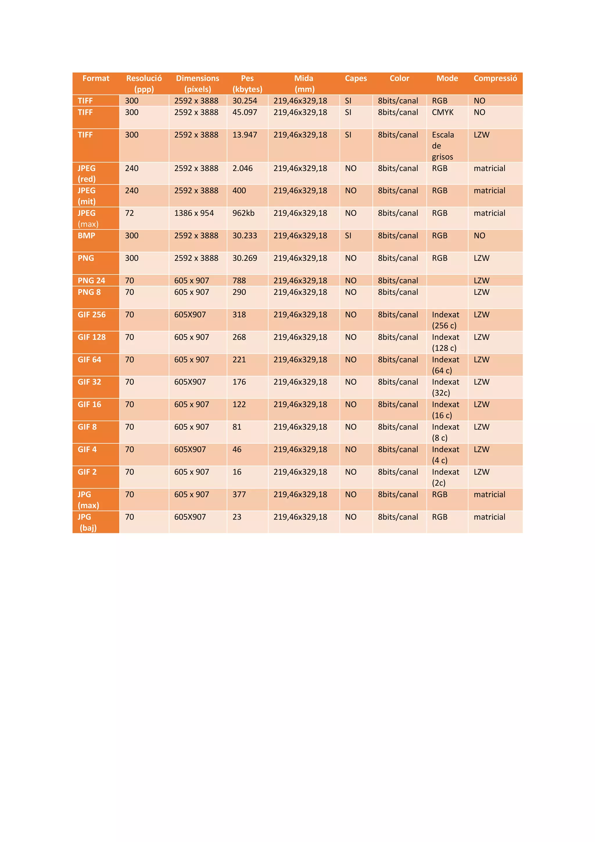 The document compares file formats and compression levels for digital images. It lists image resolution, file size, dimensions, color mode, and compression for TIFF, JPEG, BMP, PNG and GIF file formats at various quality settings. Higher resolution and uncompressed files like TIFF result in much larger file sizes, while heavily compressed formats like JPEG and GIF at low quality settings produce smaller file sizes. Color depth and palette indexes also impact the file size of GIF and PNG images.