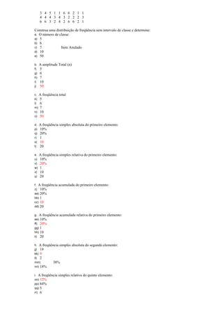 1. O documento apresenta exercícios resolvidos sobre estatística descritiva de uma disciplina de probabilidade e estatística. 2. Os exercícios abordam conceitos como população, amostra, estatística descritiva, distribuição de frequência e gráficos. 3. As questões pedem para identificar conceitos, sugerir tipos de amostragem, construir tabelas e gráficos de distribuição de frequência e analisar dados.