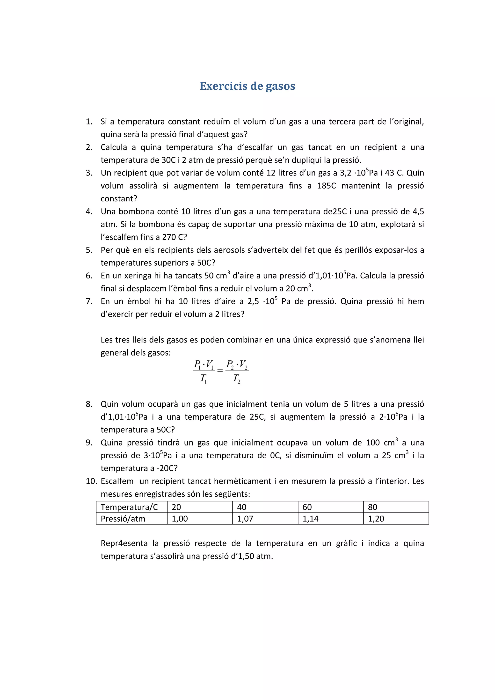 Exercicis de gasos<br/>Si a temperatura constant reduïm el volum d’un gas a una tercera part de l’original, quina serà la pressió final d’aquest gas?<br />Calcula a quina temperatura s’ha d’escalfar un gas tancat en un recipient a una temperatura de 30C i 2 atm de pressió perquè se’n dupliqui la pressió.<br />Un recipient que pot variar de volum conté 12 litres d’un gas a 3,2 ·105Pa i 43 C. Quin volum assolirà si augmentem la temperatura fins a 185C mantenint la pressió constant?<br />Una bombona conté 10 litres d’un gas a una temperatura de25C i una pressió de 4,5 atm. Si la bombona és capaç de suportar una pressió màxima de 10 atm, explotarà si l’escalfem fins a 270 C?<br />Per què en els recipients dels aerosols s’adverteix del fet que és perillós exposar-los a temperatures superiors a 50C?<br />En un xeringa hi ha tancats 50 cm3 d’aire a una pressió d’1,01·105Pa. Calcula la pressió final si desplacem l’èmbol fins a reduir el volum a 20 cm3.<br />En un èmbol hi ha 10 litres d’aire a 2,5 ·105 Pa de pressió. Quina pressió hi hem d’exercir per reduir el volum a 2 litres?<br />Les tres lleis dels gasos es poden combinar en una única expressió que s’anomena llei general dels gasos:<br />Quin volum ocuparà un gas que inicialment tenia un volum de 5 litres a una pressió d’1,01·105Pa i a una temperatura de 25C, si augmentem la pressió a 2·105Pa i la temperatura a 50C?<br />Quina pressió tindrà un gas que inicialment ocupava un volum de 100 cm3 a una pressió de 3·105Pa i a una temperatura de 0C, si disminuïm el volum a 25 cm3 i la temperatura a -20C?<br />Escalfem un recipient tancat hermèticament i en mesurem la pressió a l’interior. Les mesures enregistrades són les següents:<br />Temperatura/C20406080Pressió/atm1,001,071,141,20<br />Repr4esenta la pressió respecte de la temperatura en un gràfic i indica a quina temperatura s’assolirà una pressió d’1,50 atm.<br />