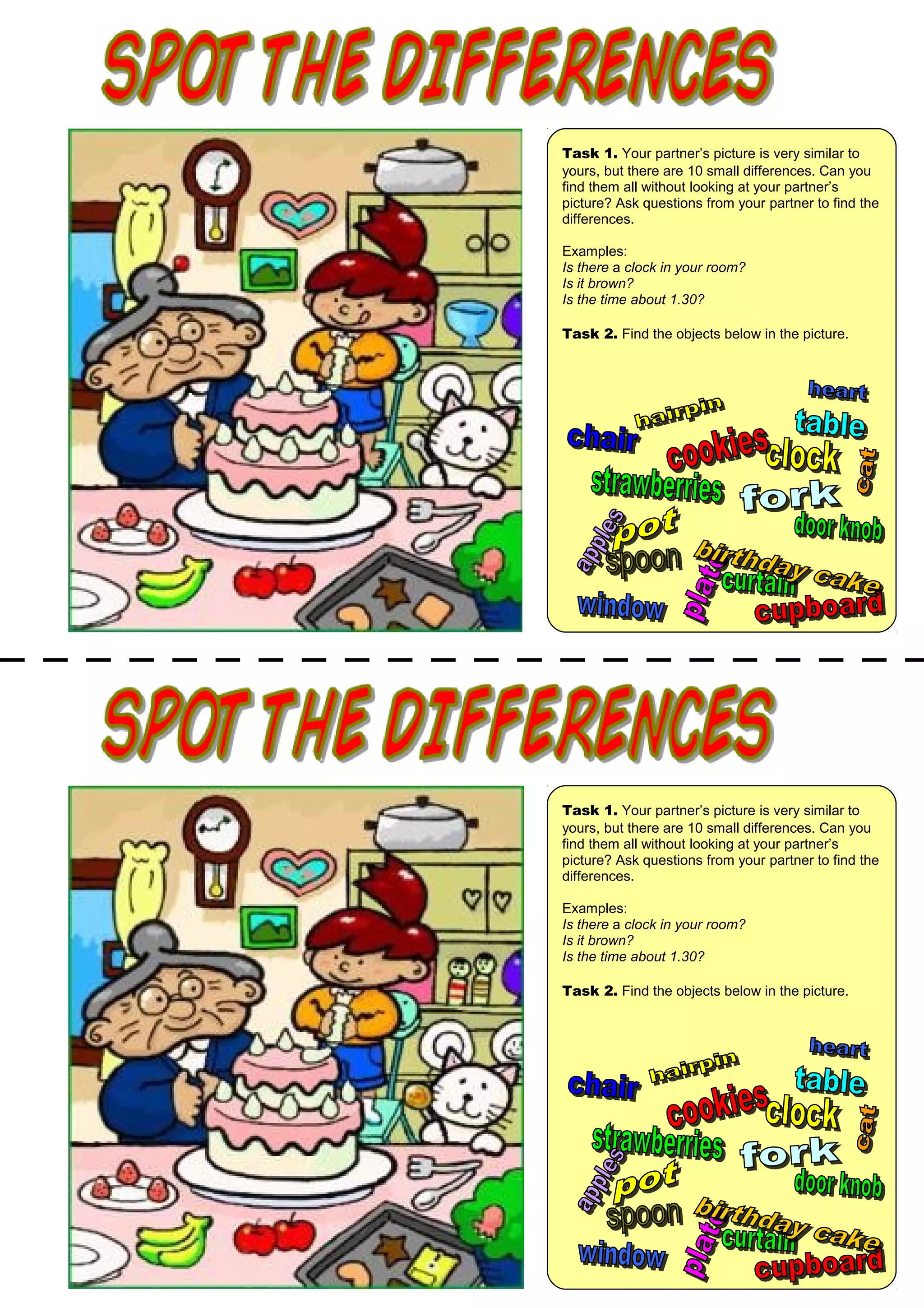 The document describes two similar pictures with 10 small differences between them. It instructs partners to take turns asking questions to find the differences without looking at each other's pictures. It then lists the 10 differences between the pictures, which include details like the shape of door knobs, the time on a clock, objects in a cupboard, what a cat is holding, a hair accessory, the number of bananas on a table, and whether a girl is barefoot or wearing socks.