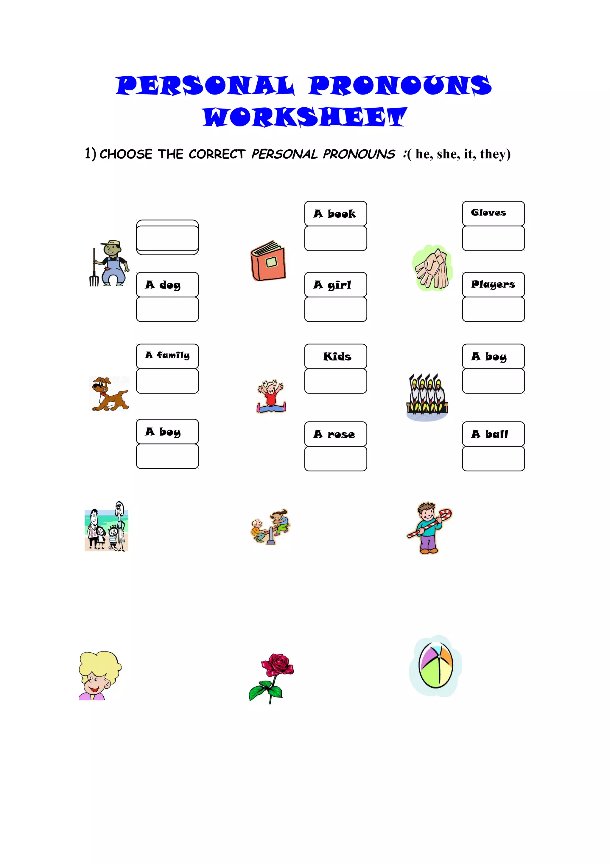 This document is a worksheet about personal pronouns. It contains two sections: the first asks the reader to choose the correct personal pronoun to fill in blanks describing various nouns, such as a book, gloves, a farmer, etc. The second section asks the reader to change sample sentences by replacing nouns with the appropriate personal pronouns. The worksheet helps practice identifying and using personal pronouns like he, she, it, they in sentences.