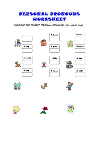 This document is a worksheet about personal pronouns. It contains two sections - the first asks the user to choose the correct personal pronoun to fill in blanks describing various nouns. The second section provides example sentences and asks the user to replace nouns with the appropriate personal pronouns. The worksheet helps users practice identifying and using personal pronouns like he, she, it, they to replace nouns in sentences.
