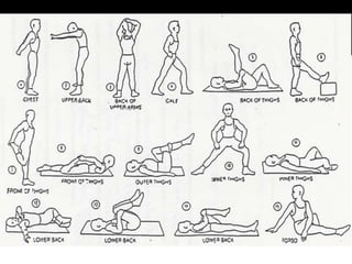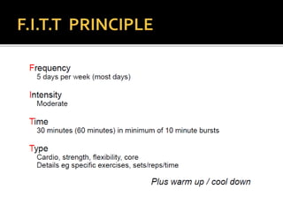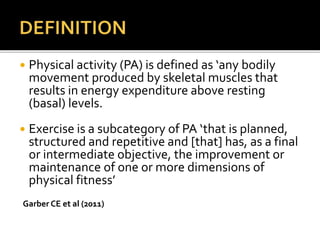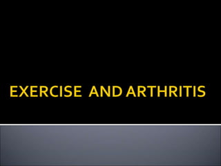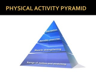 The document discusses different types of physical activity and exercise that can be beneficial for patients with joint or muscle issues. It describes flexibility, resistance, and aerobic exercises. Flexibility exercises involve stretching to improve range of motion, while resistance exercises can increase strength using weights or resistance bands. Aerobic exercise includes low-impact activities to improve cardiovascular fitness. The benefits of regular physical activity for patients include reduced pain, improved muscle function and quality of life.