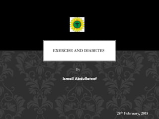 - The document discusses exercise and diabetes, outlining the benefits of exercise for diabetes management and guidelines for a safe exercise program. It provides details on warm up, active exercises and cool down phases. Regular exercise is recommended to help control blood sugar levels and reduce diabetes complications by improving insulin sensitivity and cardiovascular health. Exercising requires monitoring blood glucose levels before, during, and after workouts to prevent hypoglycemia.