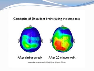 Exercise increases levels of brain-derived neurotrophic factor (BDNF) which encourages neurogenesis and strengthens synaptic connections in the brain. This improves cognitive functions like learning, focus, and memory formation. Studies show exercise may be as effective as antidepressants in treating depression and other mood disorders by optimizing neurotransmitter and neurohormone levels. Regular physical activity engages the entire brain and is crucial for its health and development across the lifespan.