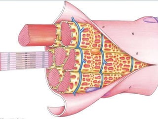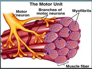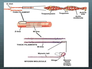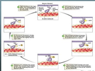 This document discusses exercise physiology and the structure and function of exercising muscle. It begins by defining anatomy, physiology, exercise physiology, and sports physiology. It then describes the structure of muscle including the epimysium, perimysium, endomysium, plasmalemma, sarcoplasm, transverse tubules, and sarcoplasmic reticulum. It explains the sliding filament theory of muscle contraction which is driven by the hydrolysis of ATP and the release and reuptake of calcium. It concludes by describing the roles of the neuromuscular junction, action potentials, and calcium in initiating and ending muscle contraction.